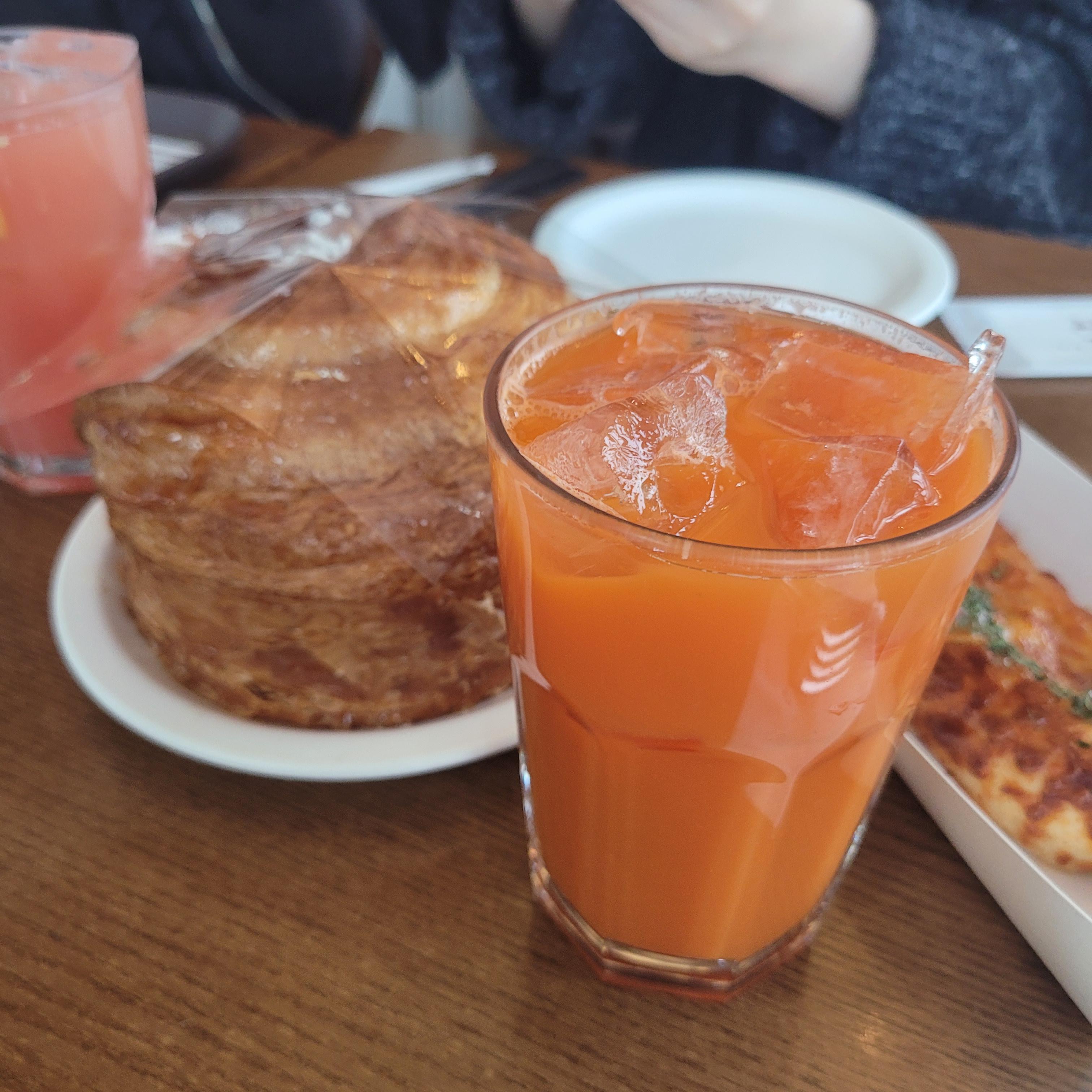 저는 요즘 커피를 줄이고 있어서 당근주스를 시켰고 친구는 자몽주스를 시켰습니다.